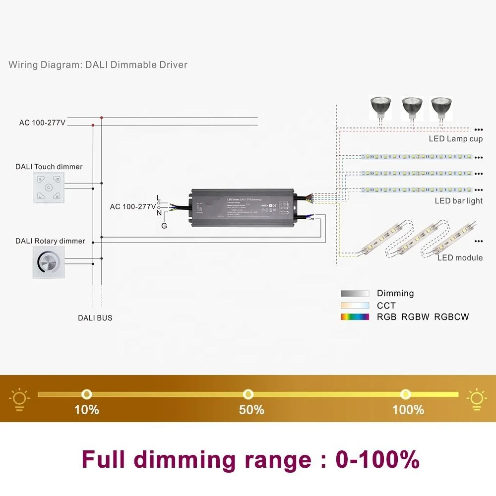 Starwell, un producător profesionist de drivere LED din China, acest driver de 100 W DALI cu tensiune constantă CCT Dimming LED este certificat DALI-2, oferind o reglare digitală precisă de la 0,1% la 100% pentru un control perfect al luminii. Include protecții esențiale împotriva scurtcircuitului, suprasarcinii și supratemperaturii, cu răcire pasivă prin convecție liberă a aerului.