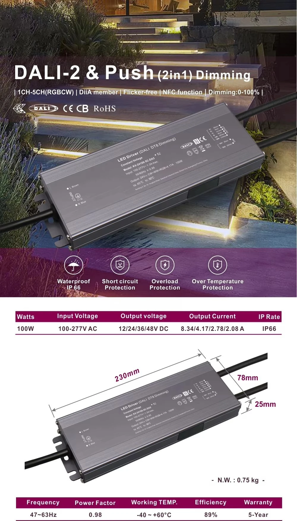 Alegeți driverul nostru DALI-2 de 100 W pentru o bază de viitor, care combină control inteligent, protecție robustă și putere versatilă într-o singură unitate compactă și fiabilă.