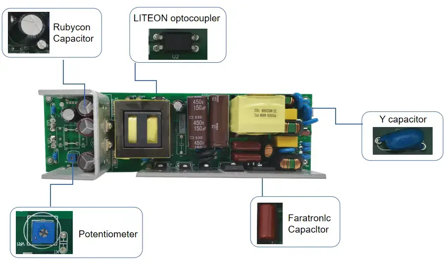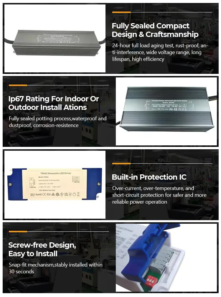 Compatibilitate la nivel înalt la apă și la scenariu complet: standard de impermeabilitate IP67, combinat cu ghivece impermeabile + tehnologie de etanșare cu turnare dintr-o singură bucată, fără scurgeri timp de 30 de minute la 1 metru sub apă, cu niveluri complet impermeabile, rezistente la umiditate și praf; Compatibil cu corpuri LED de 10-40W în medii complexe și dure exterioare, subacvatice și alte medii, cu un interval de temperatură ambientală de -20℃~60℃.