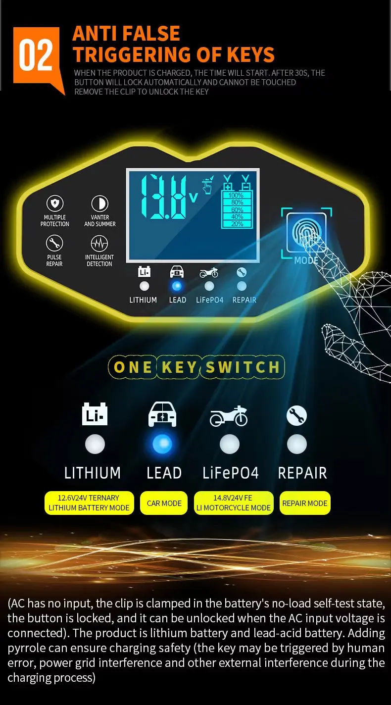 1. Inteligent și compatibil ZYX-J40 acceptă aproape orice tip de baterie de pe piață, inclusiv plumb-acid, AGM, Gel, EFB, Li-ion și LiFePO₄ (fosfat de litiu de fier). Cu o gamă largă de capacități de la 2Ah la 150Ah, se ocupă de orice, de la bateriile mici pentru motociclete până la bateriile mari de mașini.