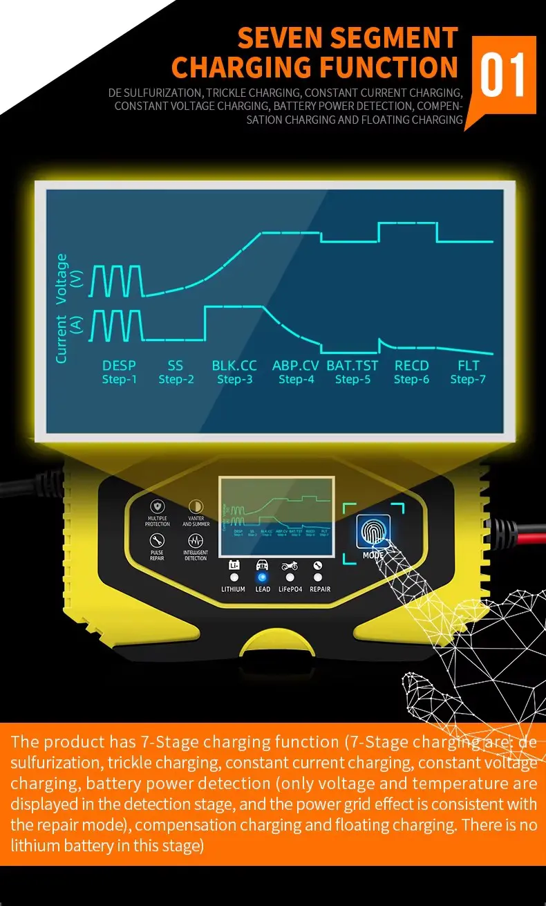 Încărcătoarele în 7 trepte sunt potrivite pentru majoritatea tipurilor de baterii, inclusiv calciu, gel AGM, umede, litiu. Acid de plumb. baterii LifePo4. De asemenea, pot ajuta la refacerea bateriilor consumate și sulfatate.