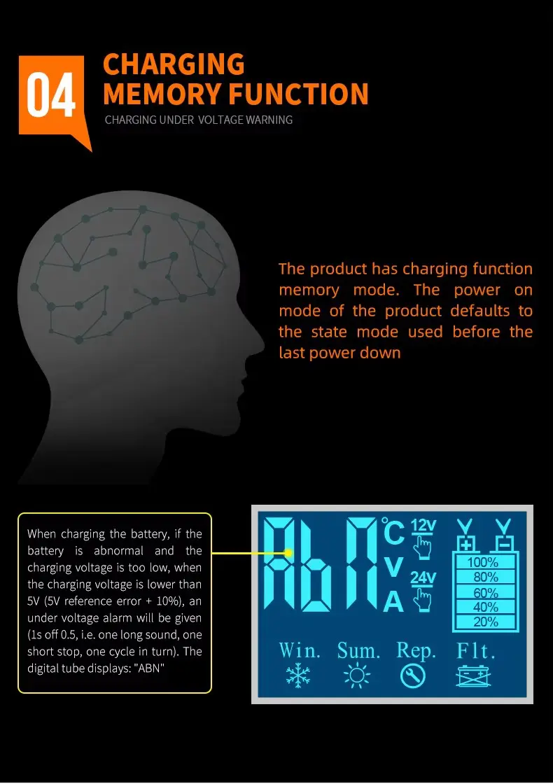 Tipuri de baterii: Cele mai multe tipuri de baterii cu plumb acid, inclusiv calciu, gel AGM.Umed, litiu. Acid de plumb. LifePo4, etc..-