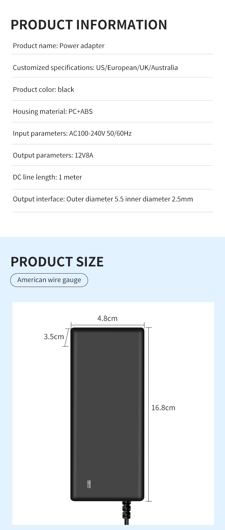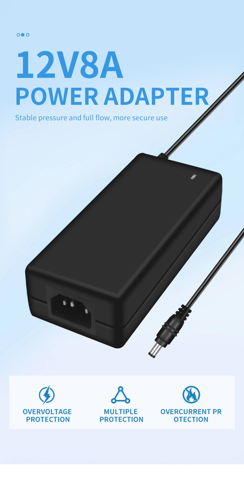 Cu o putere nominală de 96 W, curentul de ieșire al adaptorului de alimentare de 96 W se stabilizează la un vârf de 8 A, iar precizia tensiunii este controlată în ± 5% (tensiune fără sarcină: 12,1 V; tensiune la sarcină maximă: 11,8 V). Poate satisface nevoile de alimentare simultană a mai multor dispozitive (de exemplu, 2 dispozitive paralele de 48 W). Cablul de ieșire cu miez de cupru pur asigură o cădere de tensiune de ≤0,3V, menținând performanța neatenuată în timpul transmisiei cu curent ridicat.