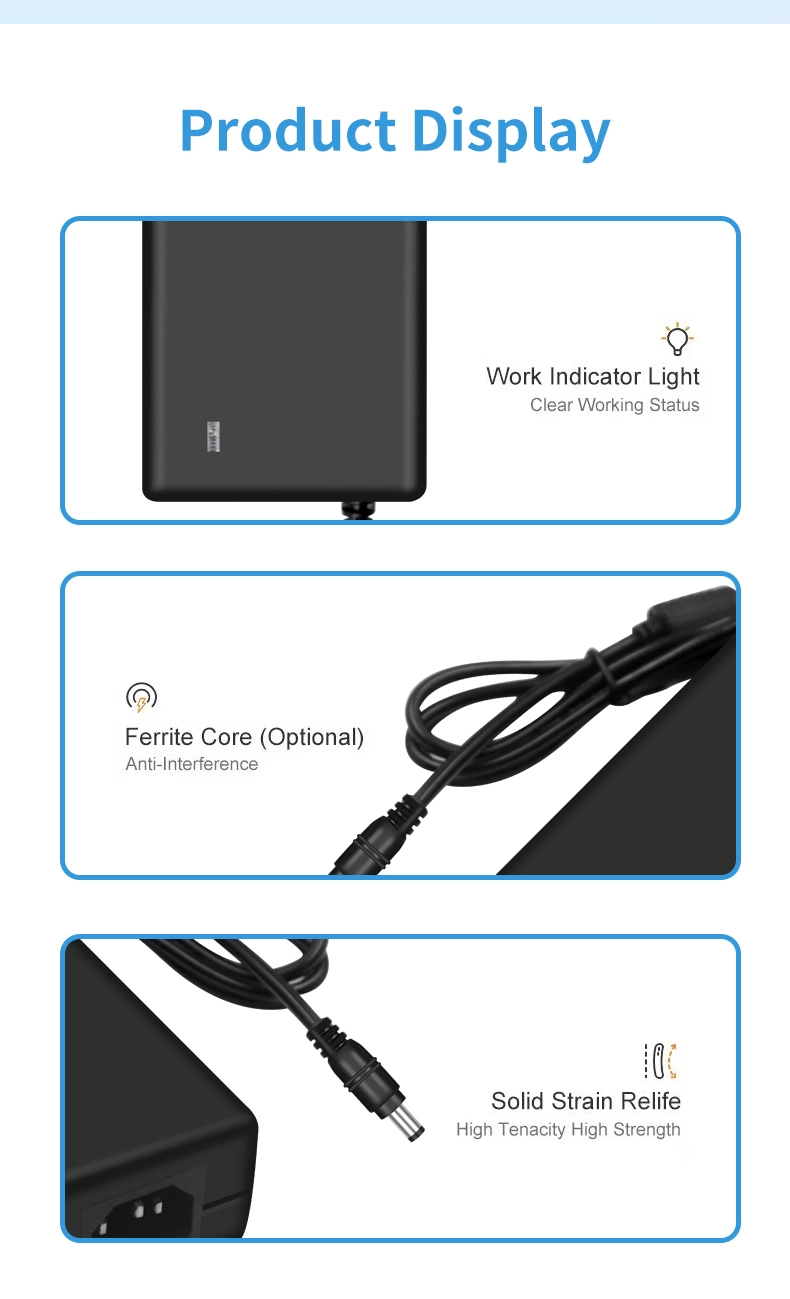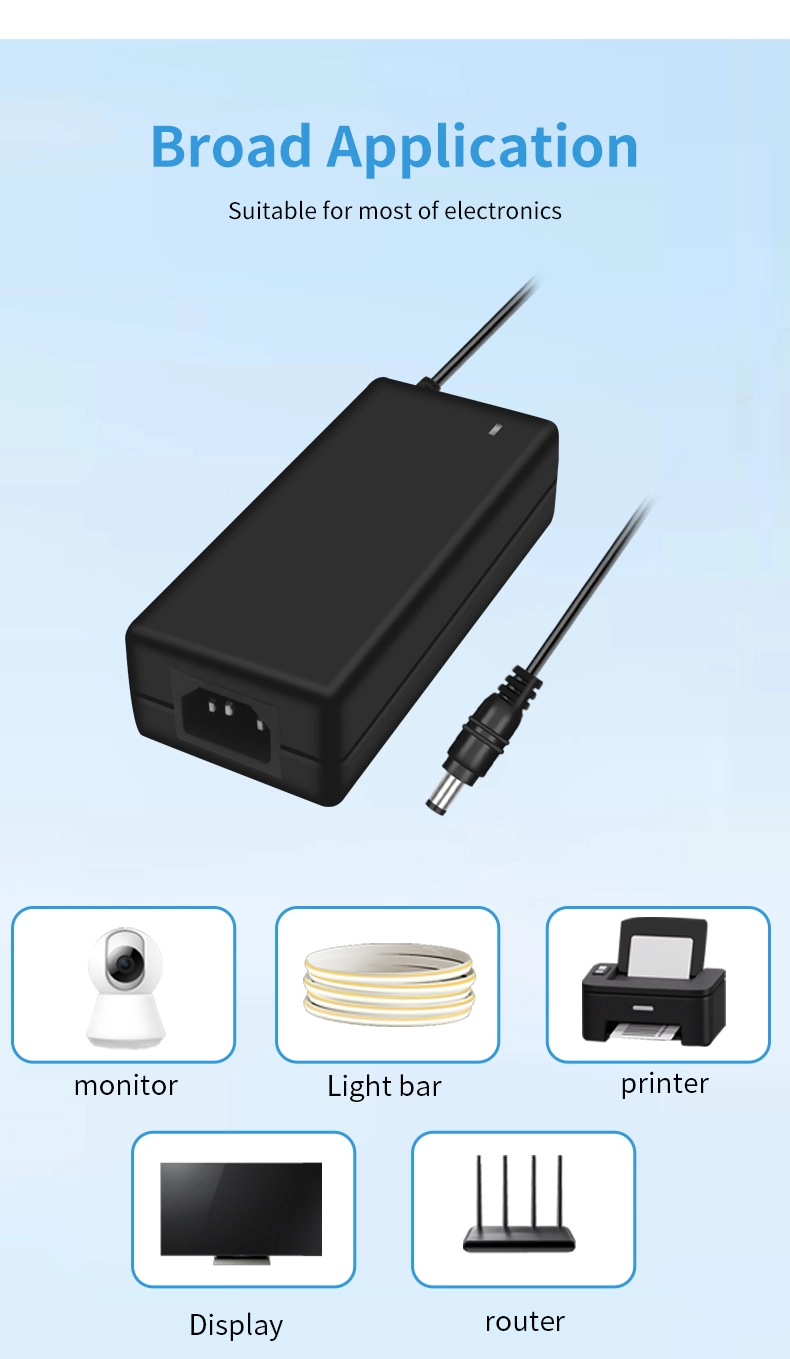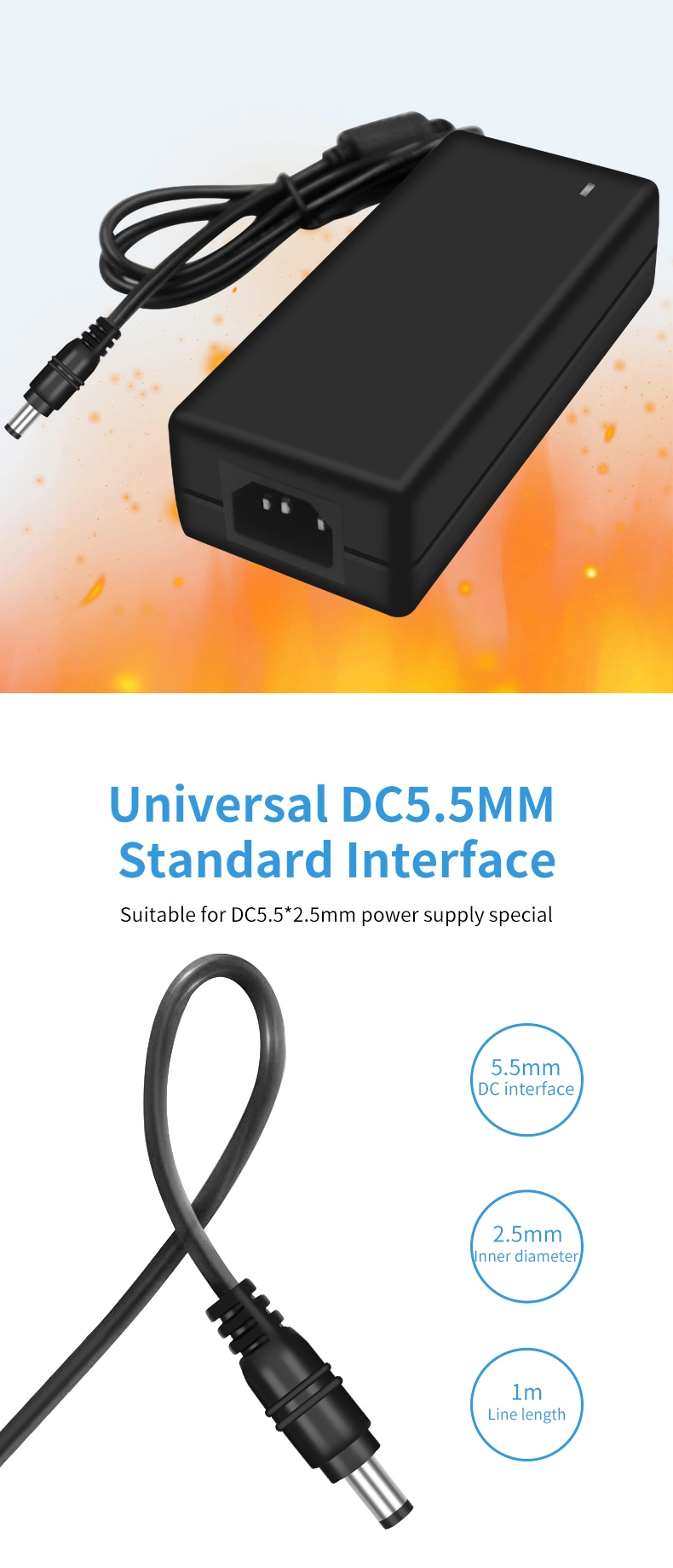 Tensiunea de intrare AC 100-240V este compatibilă cu rețelele electrice din peste 100 de țări din întreaga lume. Cablul de ieșire prelungit de 1,5 m (1,0 mm² diametru) asociat cu un conector DC rotativ la 180° se adaptează la diferite scenarii de instalare. Cu o dimensiune compactă de numai 120×60×30 mm, este cu 35% mai mic decât adaptoarele tradiționale de aceeași putere, cântărind doar 280 g — îmbunătățind portabilitatea cu 50%.