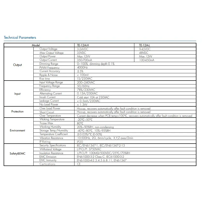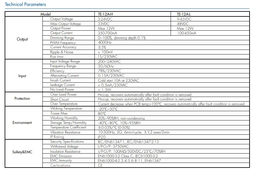 Tensiune de intrare: 200-240VAC 50-60Hz Curent de intrare: 0,15 A Putere de ieșire: 12 wați max Tensiune de ieșire: 9 ~ 42V Garantie: 2 ani Certificat: CE/Rohs