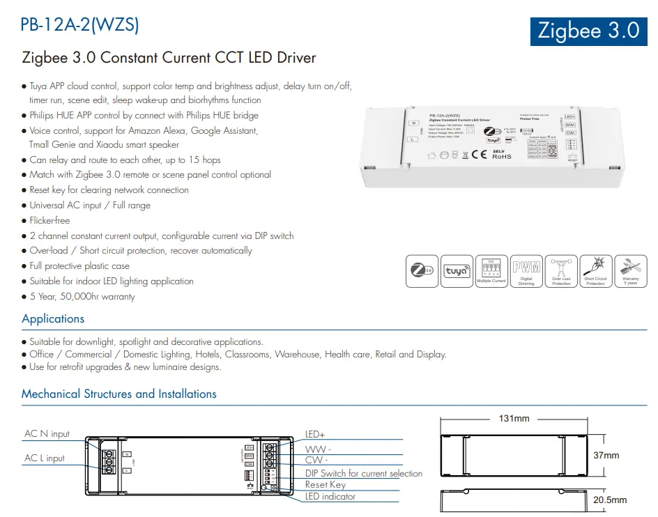 Proiectat pentru încărcări cu LED-uri de max.12 W, driverul LED Zigbee 3.0 oferă funcții complete de protecție de siguranță. Ieșirea stabilă și comunicația wireless fiabilă îl fac ideal pentru diverse proiecte de iluminat inteligent de interior cu stabilitate pe termen lung.