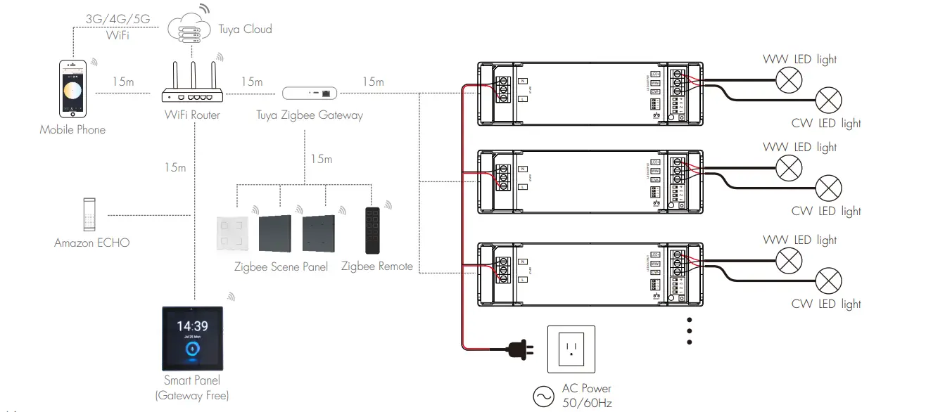 Driverul LED TUYA Zigbee suportă pe deplin protocolul TUYA Zigbee pentru o conexiune wireless stabilă, obținând un CCT fără pâlpâire și o diminuare a luminozității. Acceptă controlul APP, controlul vocal, controlul grupului și modul scenă, aducând o mare comoditate sistemelor inteligente de iluminat.
