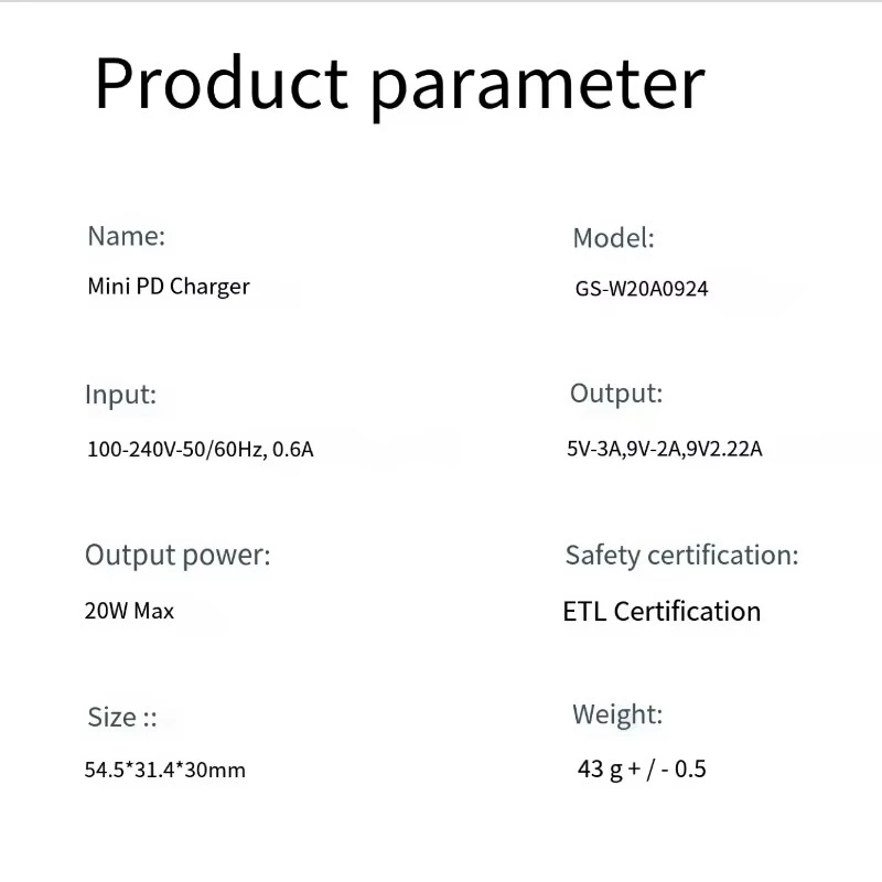 Specificații încărcător PD cu priză versiunea Japoniei de 20 W: |