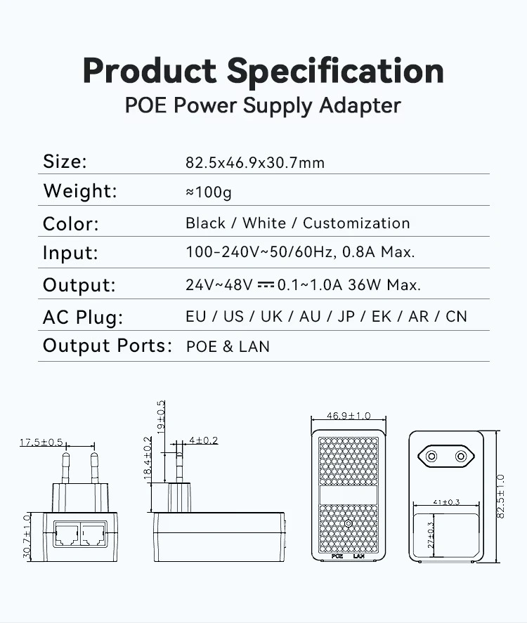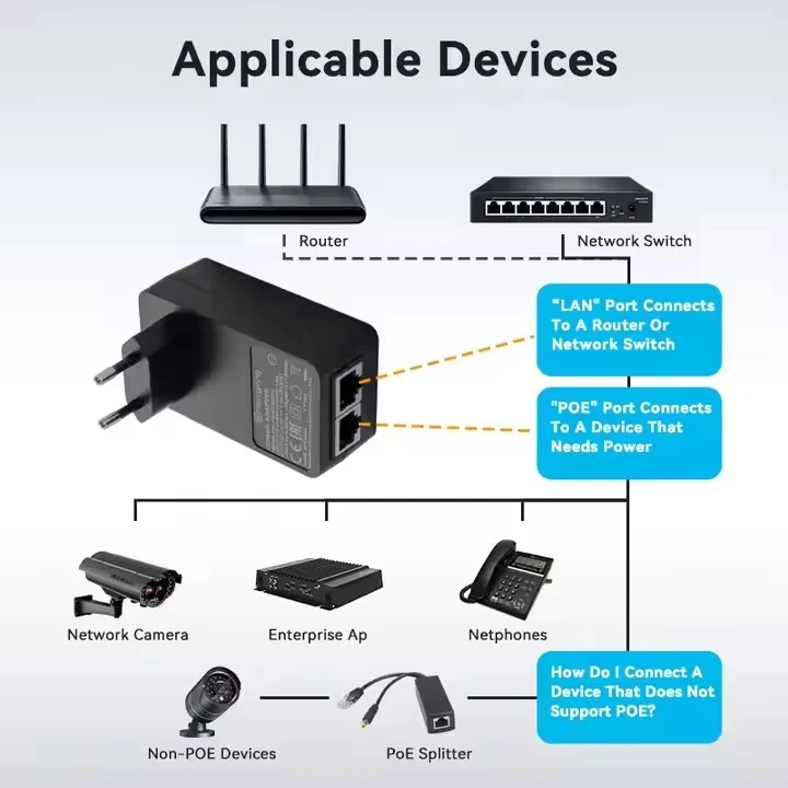 Injectorul POE cu priză UE montat pe perete de 24V 1A din fabrică STARWELL are o intrare universală AC (100-240V) cu ieșiri selectabile: 24V/0,5A, 24V/1A sau 48V/0,5A. Suportă atât protocoale PoE pasive, cât și active, cu alocări flexibile de pin, inclusiv Midspan (4,5+/7,8-) și Endspan (1,2+/3,6-). Complet pe deplin cu standardele IEEE802.3af/at/bt PoE++, oferă capabilități excepționale de viteză a datelor, variind de la 10/100/1000M la 2,5G/5G/10G bps.