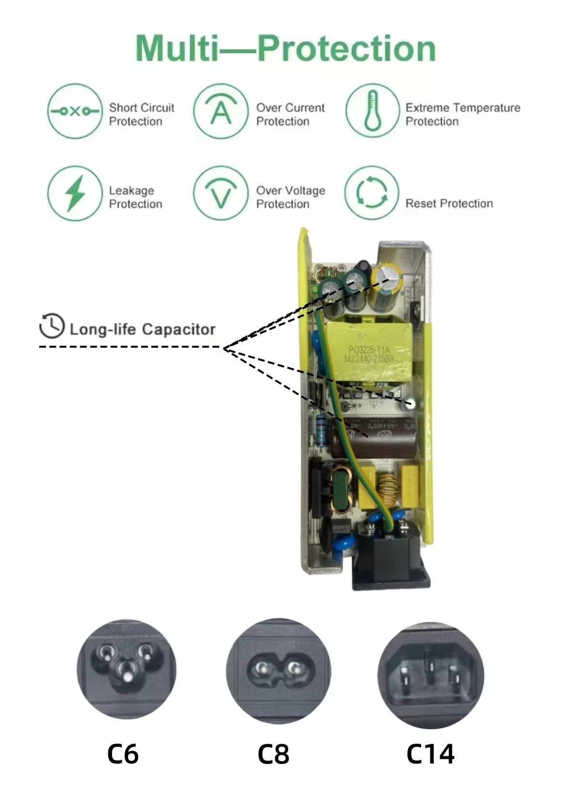 Protecții complete de siguranță: Măsurile de protecție integrate, inclusiv protecția la supracurent (OCP), protecția la supratensiune (OVP) și protecția la scurtcircuit (SCP) previn deteriorarea adaptorului și a echipamentului dumneavoastră valoros.