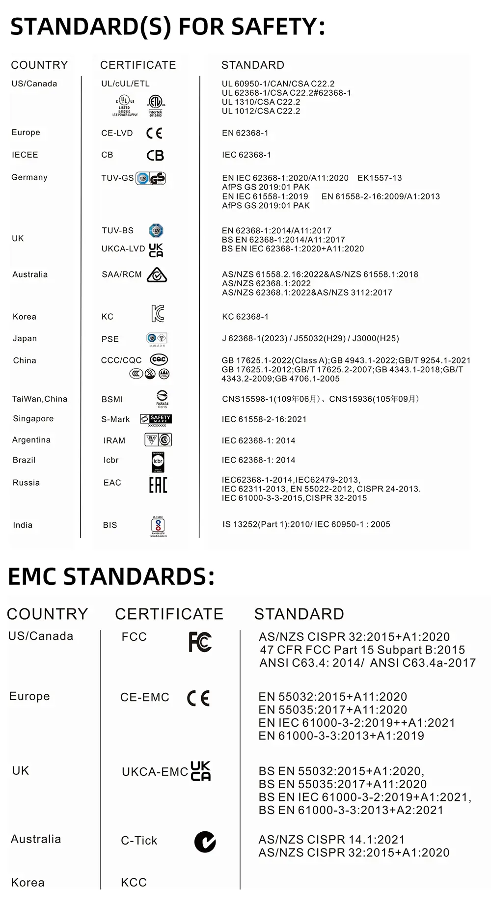 Siguranța ta este primordială. Acest adaptor este proiectat și fabricat pentru a îndeplini standardele internaționale stricte, asigurând nu numai performanță fiabilă, ci și liniște sufletească. Este compatibil cu ETL CE FCC TUV GS CB PSE KC KCC BIS SAA RCM c-Tick CCC UKCA UL cUL RoHS , care reglementează securitatea, sănătatea și protecția mediului.