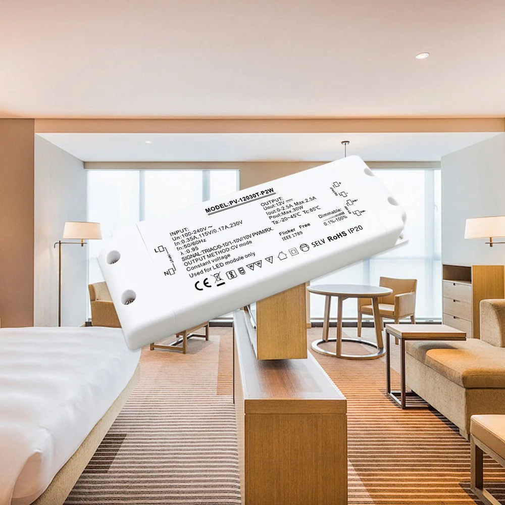 Fiind o sursă de alimentare cu tensiune constantă stabilă cu LED-uri de reglare a luminii Triac, oferă o ieșire constantă de tensiune de 12 V CC. Această sursă de alimentare reglabilă triac de 12V 30W adoptă componente de înaltă calitate și design avansat de circuit, asigurând o tensiune de ieșire stabilă pe toată gama de reglare a intensității și eliminând în mod fundamental pâlpâirea luminilor. Este un driver cu led triac cu dimming cu adevărat fără pâlpâire pentru utilizare în interior. Caracteristica sa care nu pâlpâie nu numai că creează un mediu vizual confortabil și sănătos, dar și protejează eficient sursele și modulele sensibile de lumină LED, prelungind durata de viață generală a corpurilor de iluminat.
