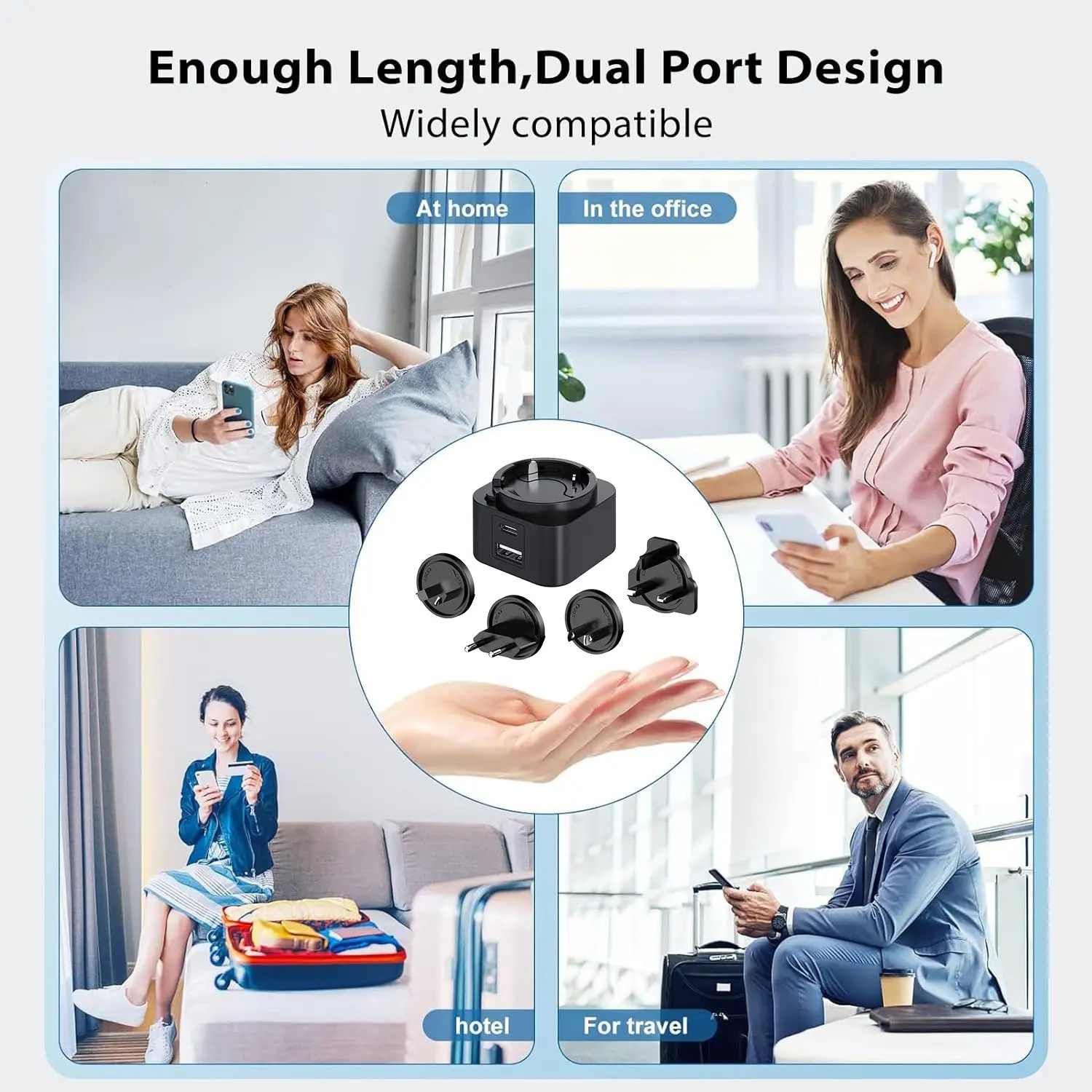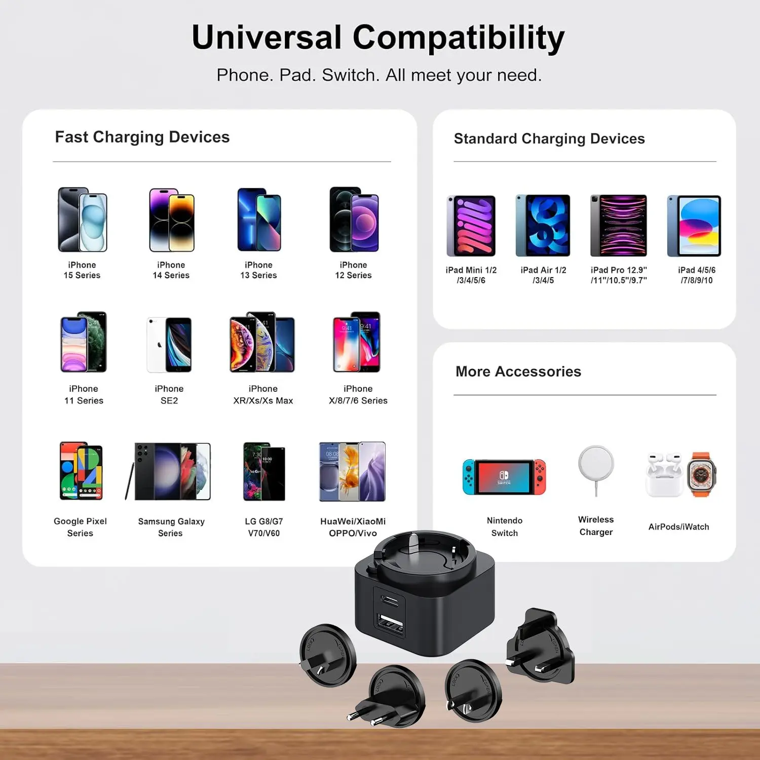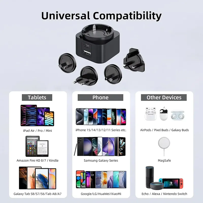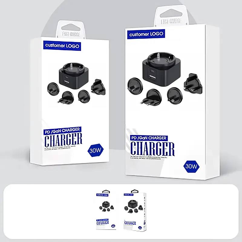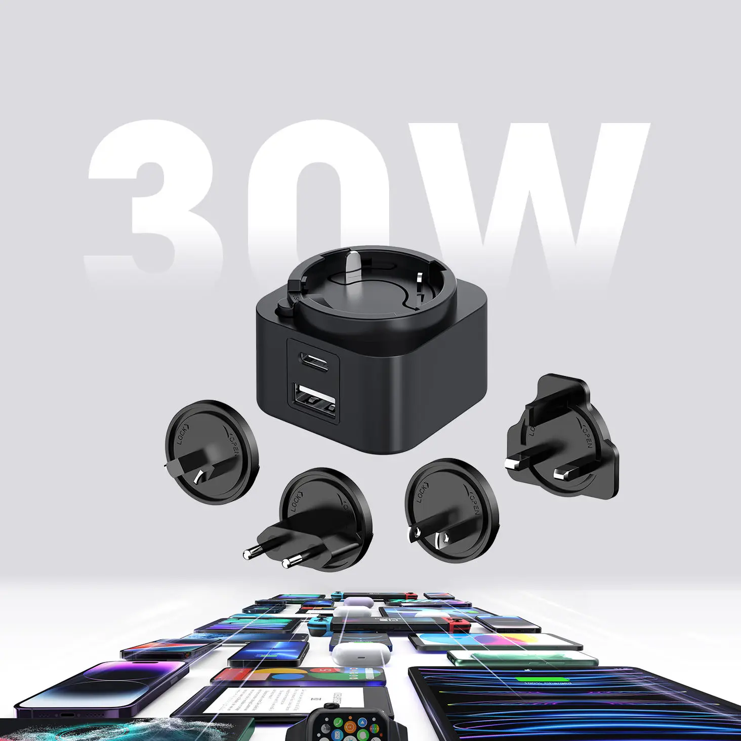 Versatilitatea este cheia. Designul cu două porturi (USB-C/USB-A) vă permite să încărcați două dispozitive simultan. Încărcătorul PD cu priză interschimbabilă de 30 W are un set de prize interschimbabile (SUA/UE/UK/AU), făcându-l partenerul tău perfect de călătorie pe tot globul. Indiferent dacă încărcați un smartphone, o tabletă sau un laptop, compatibilitatea universală asigură performanțe de top.