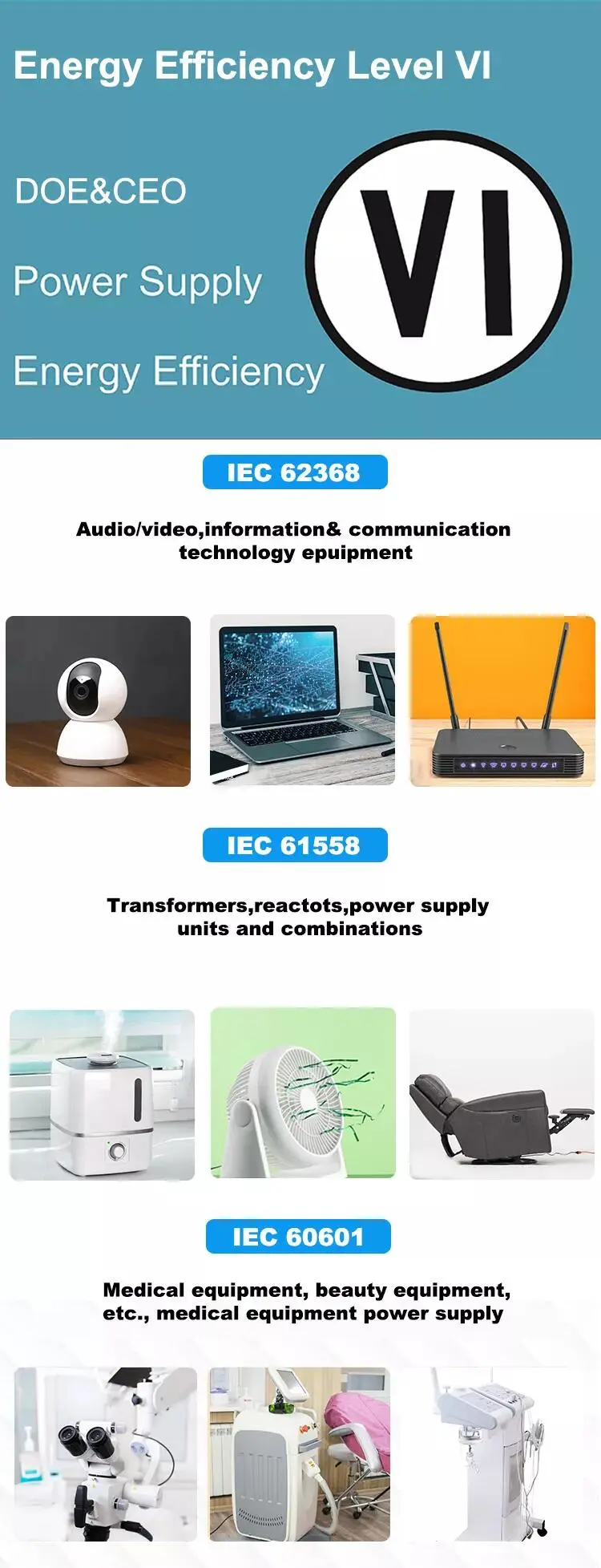 IEC62368 pentru electronice de larg consum, IEC60335 pentru încărcător de baterii, IEC60601 pentru echipamente de calitate medicală, IEC61558 pentru aplicații casnice, IEC61347 pentru iluminat cu led. |