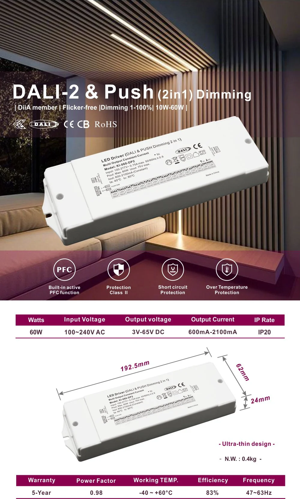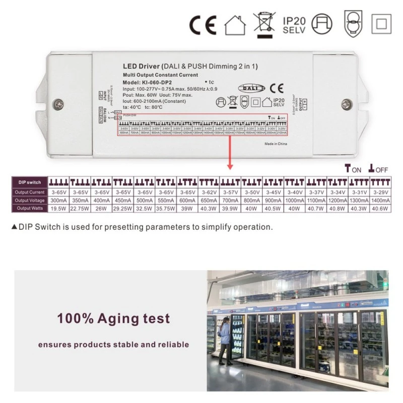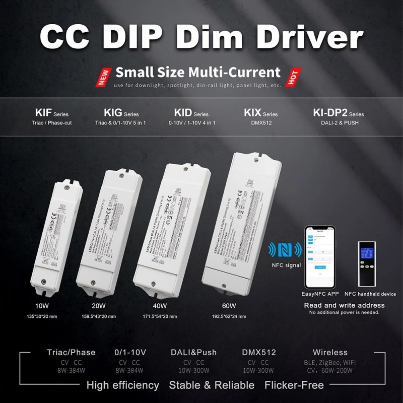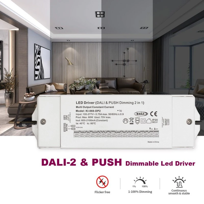 Fiind un driver LED CCT cu reglaj DALI cu curent constant de 60W, adoptă o tehnologie avansată de control al curentului constant în buclă închisă pentru a se asigura că curentul de ieșire (valoarea tipică este de 700mA, care poate fi personalizat în funcție de cerințele modulului LED ale clienților) este foarte stabil. Acest design evită efectiv atenuarea luminii sau abaterea culorii cauzate de fluctuațiile curente ale LED-urilor, garantând în mod fundamental luminozitatea pe termen lung și durata de viață a lămpilor. Gama sa largă de tensiune de intrare și caracteristicile de ieșire a curentului constant îl fac perfect compatibil cu diverse specificații de downlight-uri cu LED-uri, spoturi, panouri luminoase, lumini liniare și module de bandă luminoasă.