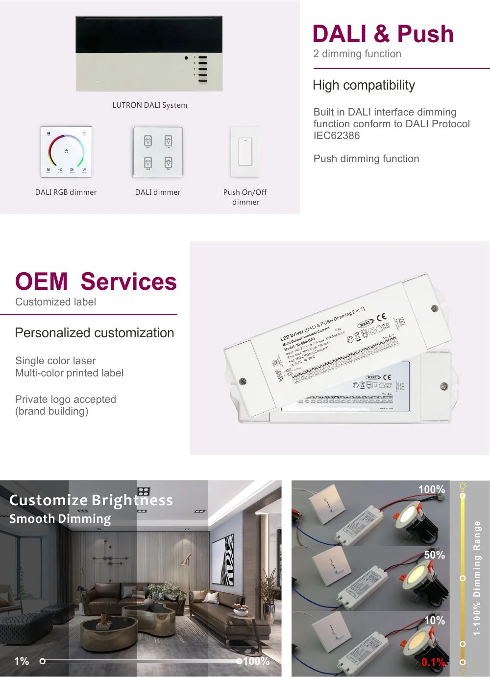 Produsul respectă cu strictețe cel mai recent standard de protocol DALI-2, depășind funcția de bază a comutatoarelor de reglare. Permite o diminuare lină, fără trepte, de la 0,1% la 100%, fără pâlpâire sau zgomot. Prin sistemul DALI, pot fi realizate cu ușurință adresarea individuală a lămpilor, controlul grupului, presetarea scenei (cum ar fi modul întâlnire și modul de petrecere a timpului liber), sarcinile programate și monitorizarea energiei. Se integrează perfect în sistemul de management inteligent al clădirii și servește drept piatră de temelie pentru crearea unui iluminat inteligent eficient și care economisește energie.