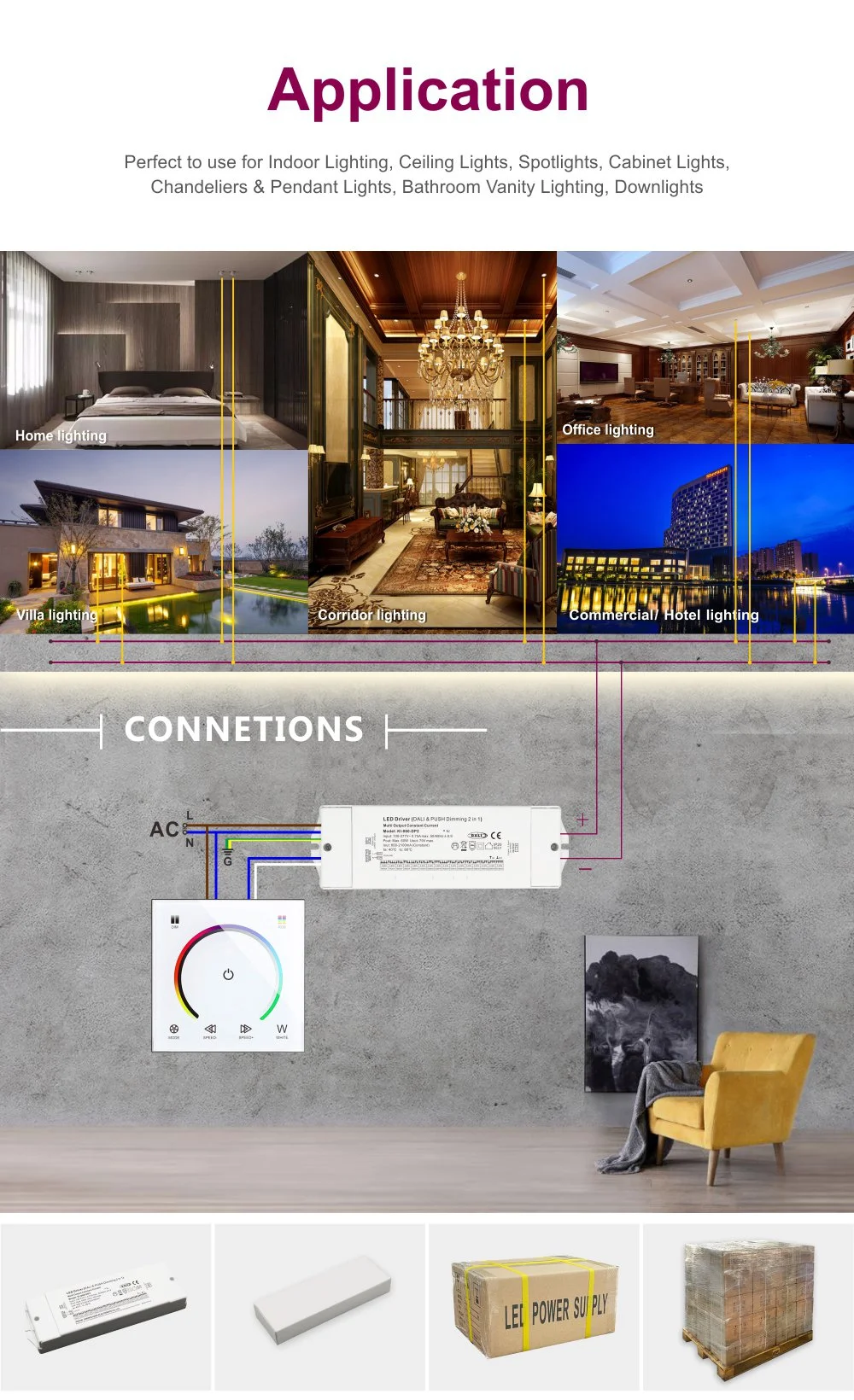 Fie că este vorba de panouri cu LED-uri în birouri, downlight-uri cu LED-uri în centrele comerciale, benzi luminoase ascunse pe coridoarele hotelului sau iluminare de accent în spațiile de acasă, acest driver este alegerea ideală. Carcasa compactă din aliaj de aluminiu cu ghiveci complet asigură un management excelent al căldurii și o funcționare stabilă pe termen lung. Circuitele multiple de protecție încorporate pentru supratensiune, supracurent, scurtcircuit și supraîncălzire oferă o protecție completă de siguranță pentru întregul sistem de iluminat.