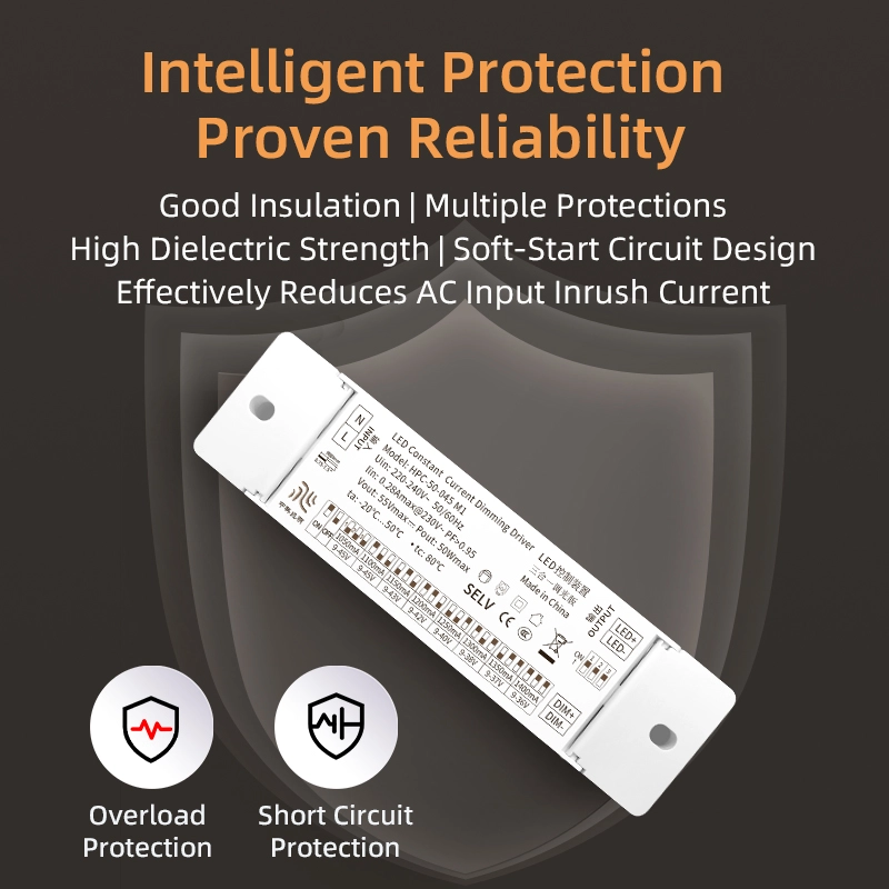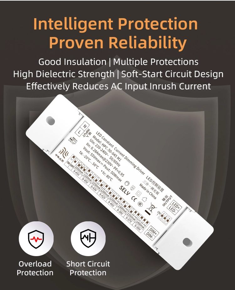Design de protecție multiplă: Construit cu patru mecanisme de protecție: supratensiune (pragul de protecție ≥55V), supracurent (pragul de protecție ≥0,18A), scurtcircuit și supraîncălzire (temperatura de protecție ≥110℃). Poate întrerupe rapid ieșirea în cazul unor condiții anormale de lucru pentru a proteja șoferul și sursele de lumină LED de deteriorare.