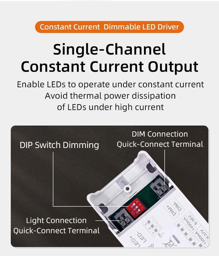 Moduri de reglare dublă: driverul LED de reglare a curentului constant acceptă intrarea semnalului de reglare duală 0-10V/1-10V. Intervalul de reglare a luminii este 0-100%, cu o liniaritate a luminozității ≥95%. Poate obține o tranziție fără întreruperi și lină de la luminozitate slabă la luminozitate maximă, fără nicio vibrație sau decalaj de scădere. Este compatibil cu diverse sisteme inteligente de reglare a luminii și poate îndeplini cerințele de iluminare ale diferitelor scenarii.