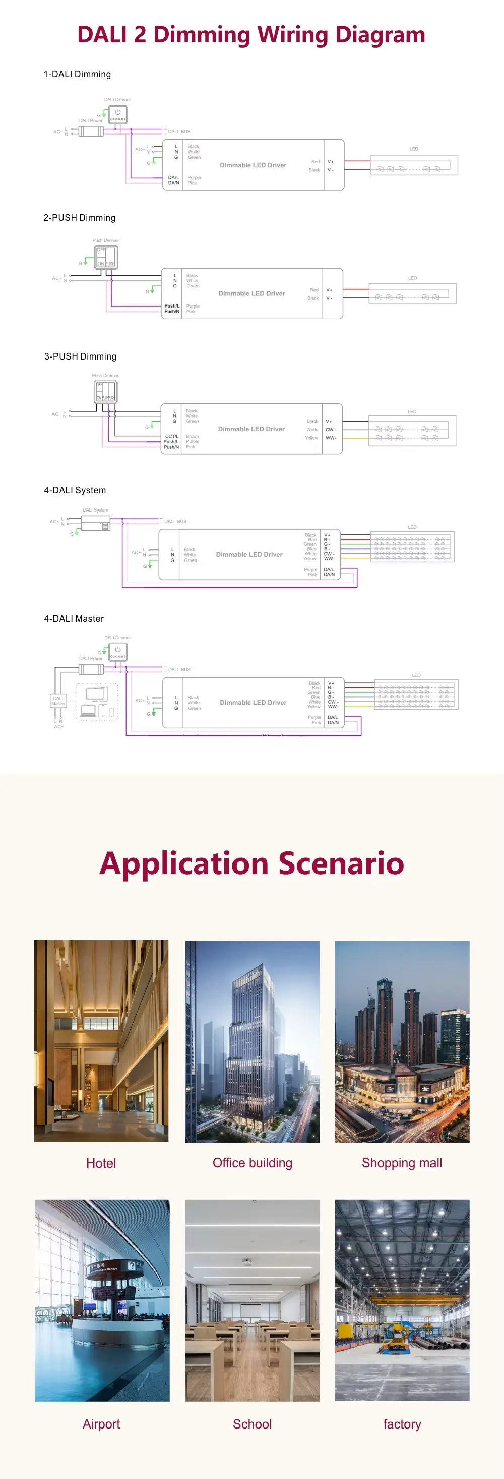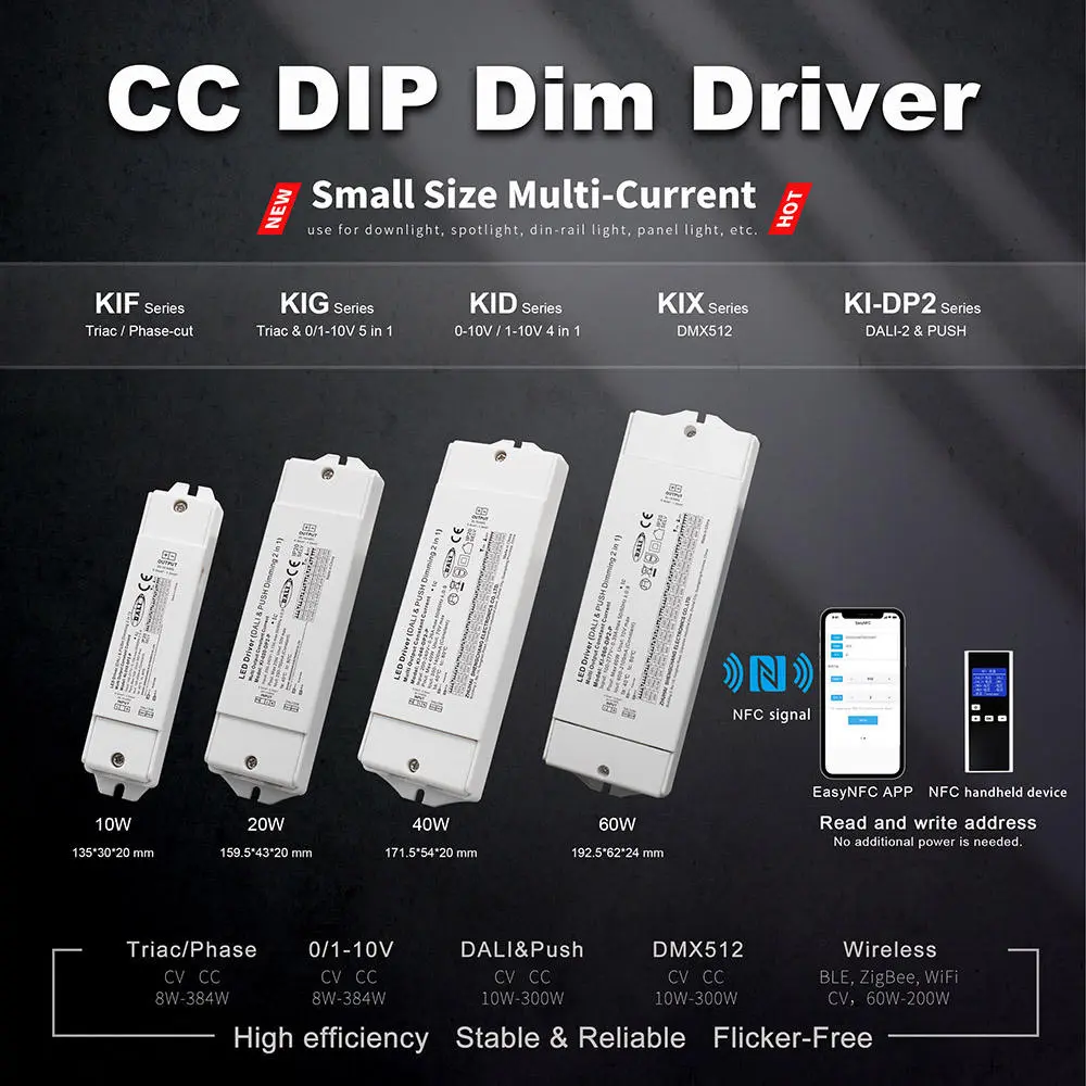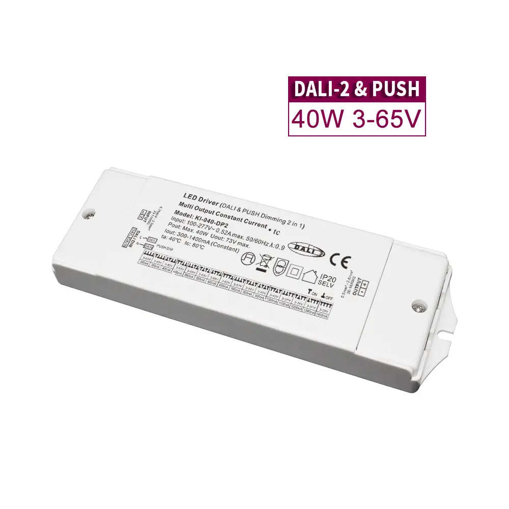 Driverul LED DALI cu curent constant CCT Dimming este potrivit pentru proiecte arhitecturale, comerciale și de ospitalitate de ultimă generație, permite reglarea precisă a temperaturii și intensității culorii luminii de la un singur driver. DALI-2 DT8 asigură un control interoperabil, pe viitor pentru scenele sofisticate și gestionarea energiei, în timp ce opțiunea manuală Push Dimming simplifică setările în care nu este necesar un sistem de control dedicat.