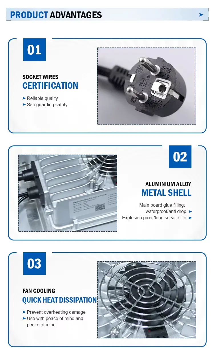 Eficiență ridicată și protecție inteligentă: Atingând o eficiență de până la 93% și un factor de putere de ≥0,98, acest încărcător minimizează pierderile de energie și reduce costurile de operare. Protecțiile încorporate includ supratensiune, scurtcircuit, polaritate inversă și supratemperatură. Un indicator LED oferă o stare clară de încărcare dintr-o privire.