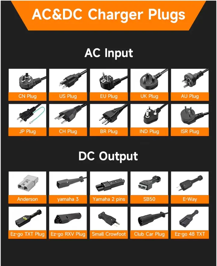 Priza UE, de obicei pentru țările UE, cum ar fi Germania, Franța, Țările de Jos, Danemarca, Austria, Suedia etc. Priza din Marea Britanie, de obicei pentru Marea Britanie, India, Pakistan, Singapore și etc. Mufa AU, de obicei pentru Australia, Noua Zeelandă, Argentina și etc. Conectorii DC obișnuiți de pe piață includ Anderson, EZ-go, DS Club Car și Yamaha Connector etc.