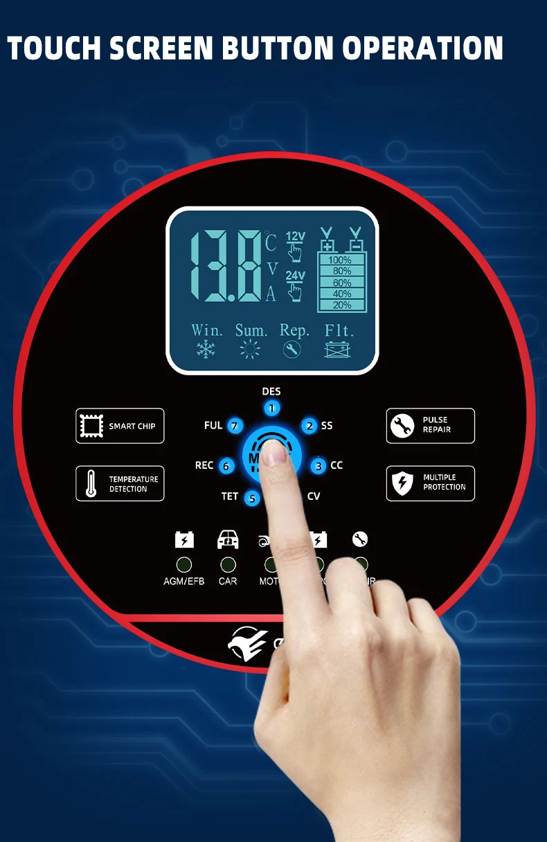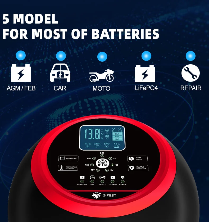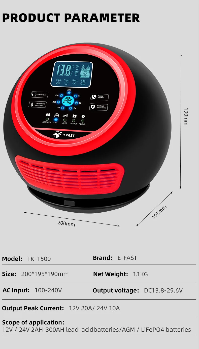 Acest încărcător are un design compact inovator și este echipat cu un afișaj LCD de înaltă definiție care arată tensiunea, curentul, temperatura, progresul încărcării și starea bateriei în timp real, făcând operarea clară dintr-o privire. Are o funcție de reparare a pulsului încorporată care poate activa și repara bateriile vechi, prelungindu-le durata de viață. Fiind un încărcător inteligent complet automat, TK-1500 acceptă funcționarea „conectare și uitare”: detectează automat tensiunea bateriei, selectează modul de încărcare și comută la un mod de întreținere a încărcării flotante după încărcarea completă pentru a preveni supraîncărcarea. Este ideal pentru întreținerea bateriei vehiculelor care sunt parcate pe perioade lungi sau a echipamentelor sezoniere precum mașinile de tuns iarba și bărcile.