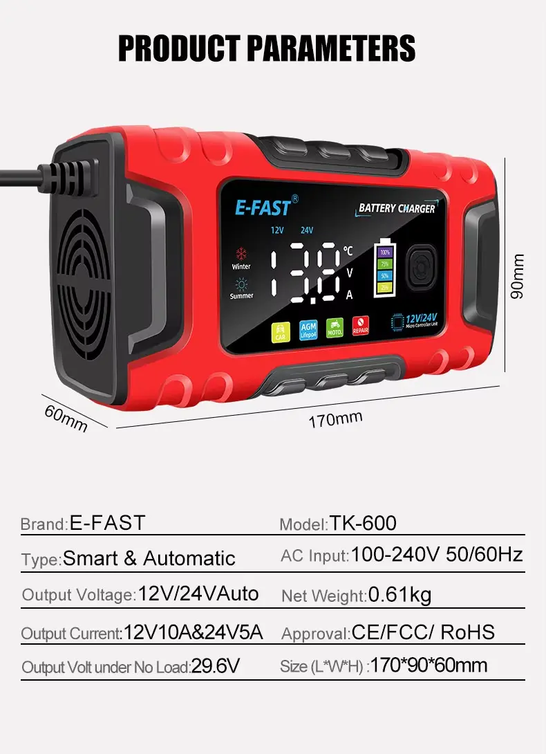 E-Fast TK-600 de înaltă calitate, complet automat cu tehnologie de reparare cu puls, încărcător de baterie lifepo4 cu plumb acid 12V10A 24V5A pentru mașină |