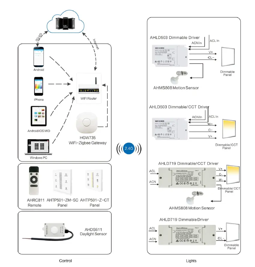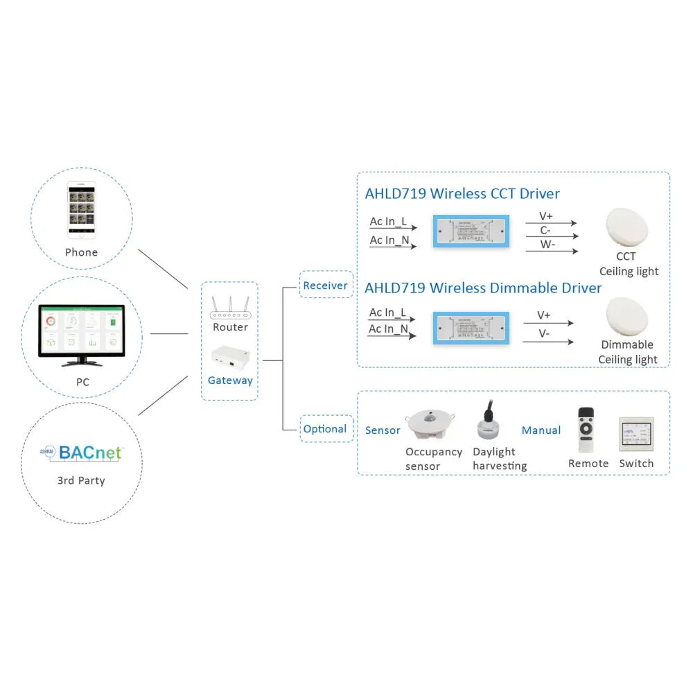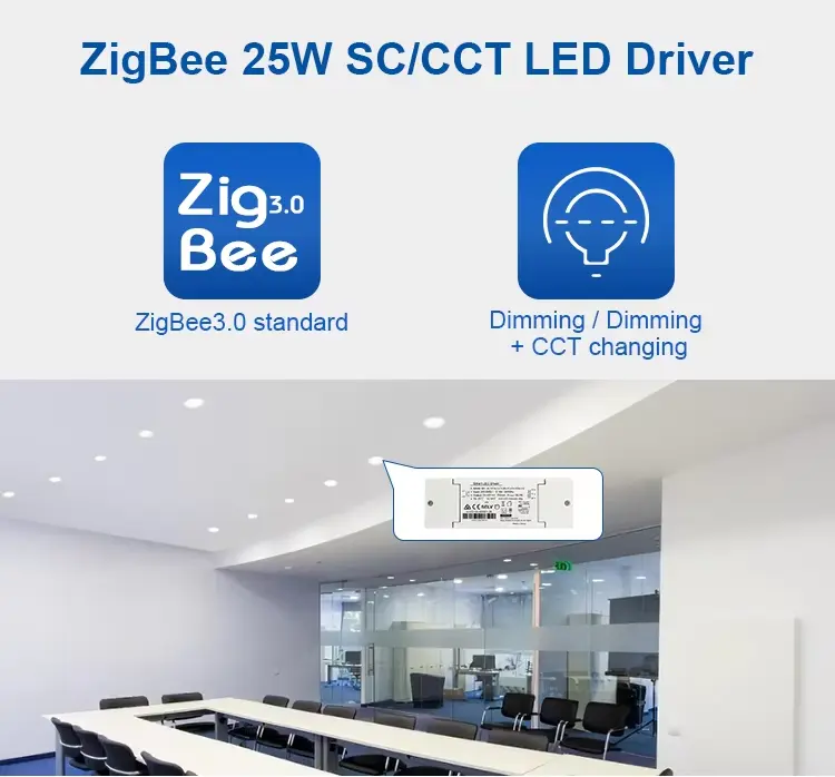 Șoferul funcționează într-o rețea mesh Zigbee și se conectează la un gateway Zigbee pentru a activa funcții inteligente de iluminare, cum ar fi programarea, controlul scenei, controlul grupului și automatizarea. Acest tip de driver LED este utilizat în mod obișnuit în sistemele inteligente de iluminat pentru casă, instalațiile de iluminat comerciale și mediile inteligente de control al clădirilor.